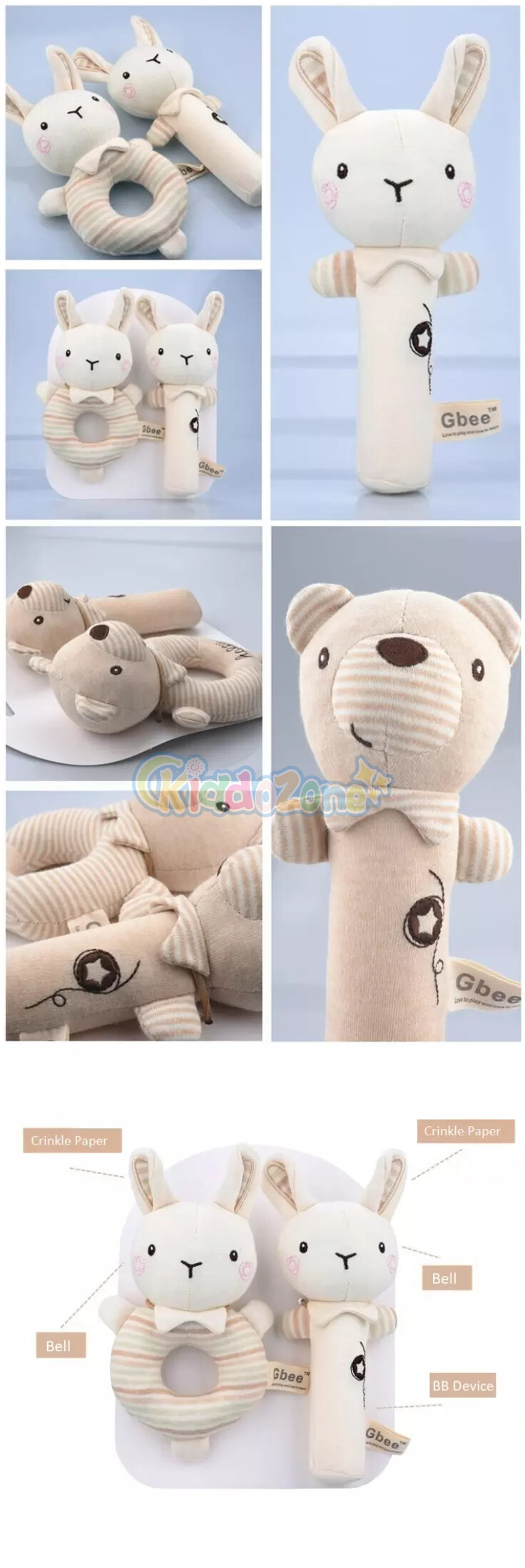 KiddoZone 2PCS婴儿摇铃儿童有机棉软挤压摇铃可爱动物安抚手摇铃毛绒手铃玩具BB声音0-3岁男孩女孩婴儿教育玩具
